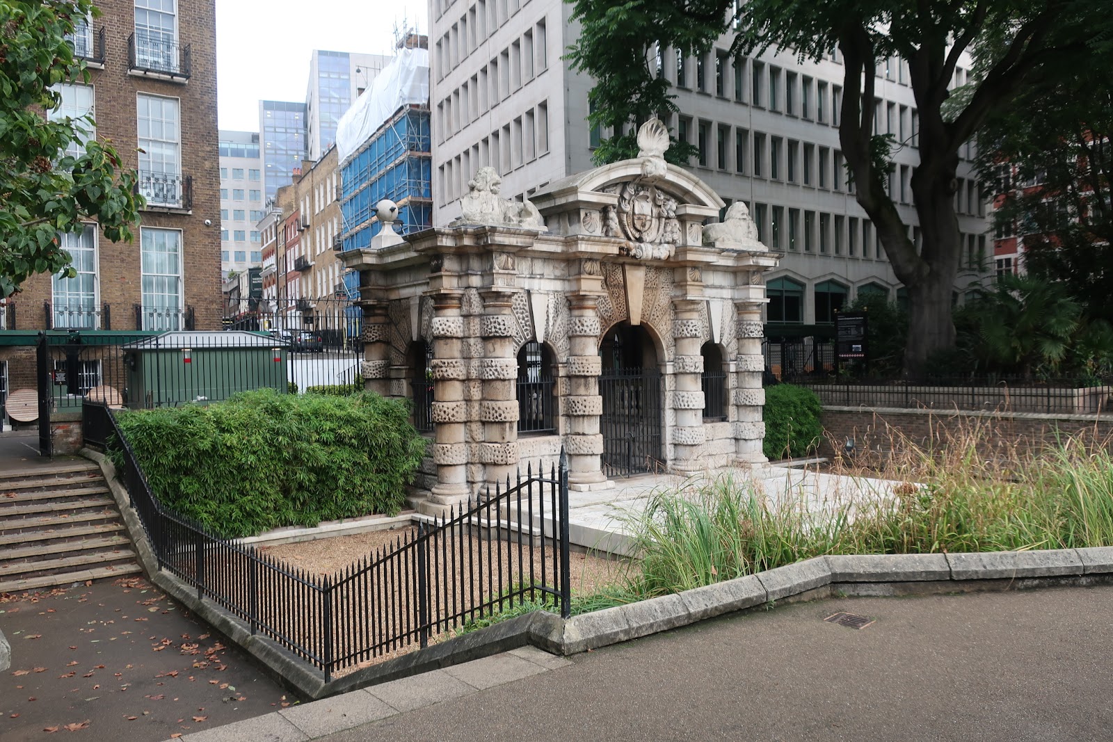 This is the York Watergate, all that remains of a former townhouse that would have been behind it. The Victoria Embankment, built as a means of cholera prevention by catching dirty water before it hit the Thames, drastically altered the waterline of the Thames River. In earlier times, water would have come right up to the gate and it would have served as an entry to the house from those arriving by river.
